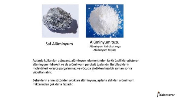 Alüminyum tuzları aşılara adjuvan olarak ekleniyor. Adjuvan maddeler, daha az aktif antijen kullanarak daha yüksek bağışıklık cevabı oluşturmak için kullanılan maddeler. Çocuklara verilen aşıların içindeki antijenlerin dozunu düşük tutmak için kullanılan bu alüminyum tuzları aynı thimerosal gibi 1930’larda aşılara eklenmeye başlamış.10 Alüminyum’un yüksek dozlarda muhtelif toksik etkileri olduğu yolunda kanıtlar olduğu doğru, ancak aşılarla alınan alüminyum miktarı bu etkileri oluşturacak dozun çok çok altında. Paraselsus’un meşhur sözünü anımsayalım: “Zehiri zehir yapan dozudur.” 11