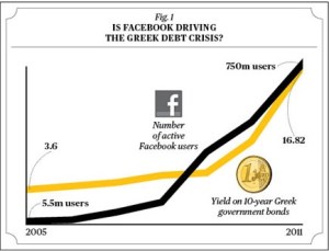 Facebook kullanıcı sayısı ile Yunanistan ekonımik krizi arasındaki korelasyonu gösteren grafik. Sizce Facebook kullanıcı sayısının artması Yunanistan’da ekonomik krize neden oluyor mu? 🙂