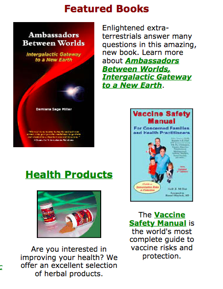 Çok vaktim olmadığından ve nasıl olsa bilimsel bir makale yazmayacağımdan sadece ilk 10 sonuç içerisindeki sitelere ve bu siteler içinde linkine rastladığım ilk “aşı karşıtı” sitelere bakmaya karar verdim. Listenin birinci sırasındaki sitenin BookStore linkine tıkladığımda “iyi ki bu işe kalkışmışım” ile “yok canım” arasında gelip giden bir ruh hali içine girdim. Bookstore’un “Önerilen Kitaplar”‘ kısmı kendi adına konuşuyor zaten: “Dünyalararası Elçiler: Yeni Dünyaya Açılan Galaksilerarası Kapı“.