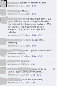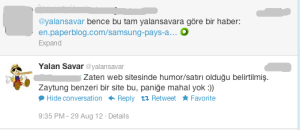 •  Haberin yayıldığı web sitesine baktığımızda, sitenin en başında haberin bariz mizah kategorisinde yer aldığı açıkça görülüyor. Daha da eğlencelisi, haber metninin tam sonunda Bu haberin doğru olduğuna inanmadınız değil mi, ama kabul edin çok eğlenceli buldunuz. diye bir satır eklemişler. “İnanılır gibi değil ama bu satırların yer aldığı sayfanın altında bile insanlar: “İşte Apple’a haddi böyle bildirilir! Yürü be Samsung!” benzeri yorumlar yapmışlar.
