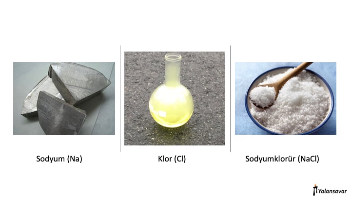 Patlayıcı bir metal olan sodyum (Na) ile zehirli bir gaz olan Klor (Cl) birleşerek hepimizin yakından bildiği softa tuzunu (NaCl) oluştur. Kimyasal tepkime sonucu ortaya çıkan NaCl kendisini oluştuan elementlerden bambaşka özelliklere sahiptir: ne sodyum gibi patlayıcı, ne klor gibi zehirlidir.