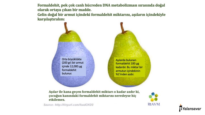 Formaldehit kelimesini duyunca hemen akıllara morgda geçen filmler, kavanozda yüzen organ parçaları geldiği için aşılarda formaldehit bulunduğunu duyan anne babaların endişelenmesi normal. Ancak pek çok kişinin bilmediği bir şey var ki o da formaldehitin aslında DNA ve protein sentezi sırasında çıkan bir yan ürün olduğu ve tüm canlı hücrelerinde zaten sentezlendiği.15 2 aylık bir bebeğin kanında, kendi vücudu tarafından sentezlenen formaldehit miktarı (1.1 mg), herhangi bir aşının içindekinden (ortalama 0.1 mg) çok çok fazla. Bir armut yediğimizde ise bir doz aşının içinde bulunan formaldehitten 50 kat daha fazlasını alıyoruz.