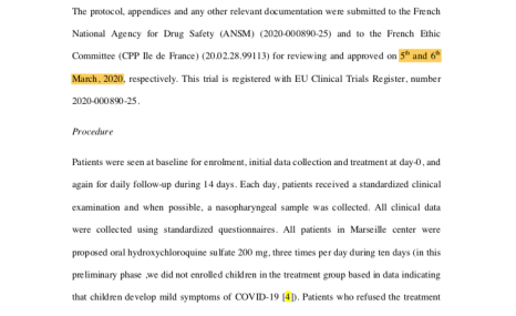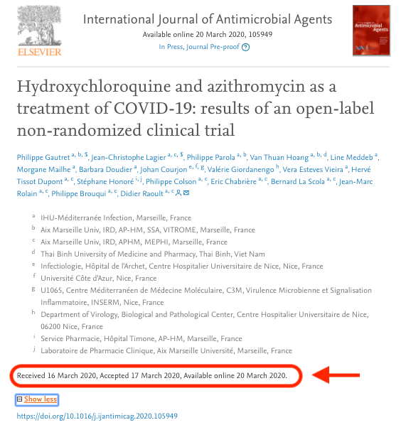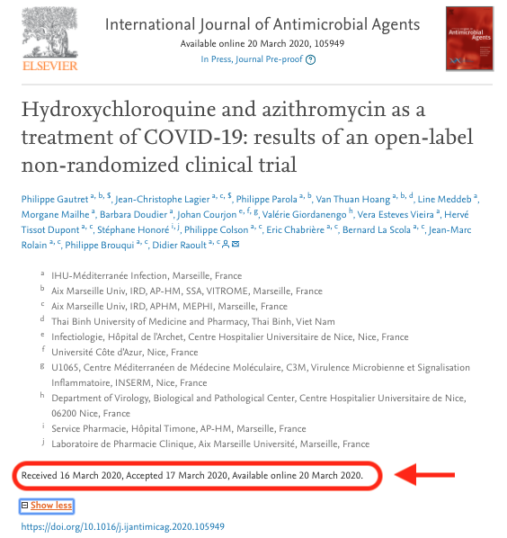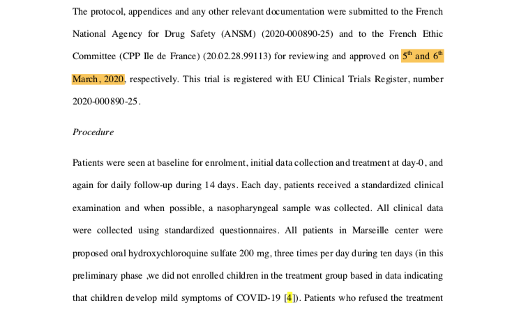 Bu tedavi protokolü, Fransız Ulusal İlaç Güvenlik Kurulu tarafından 5 Mart 2020 tarihinde onaylanmış. Makale, hastaların 14 gün boyunca izlendiğini söylüyor ve 16 Mart tarihinde yayınlanması için başvurulmuş. Aşağıdaki ekran görüntüsüne bakın.