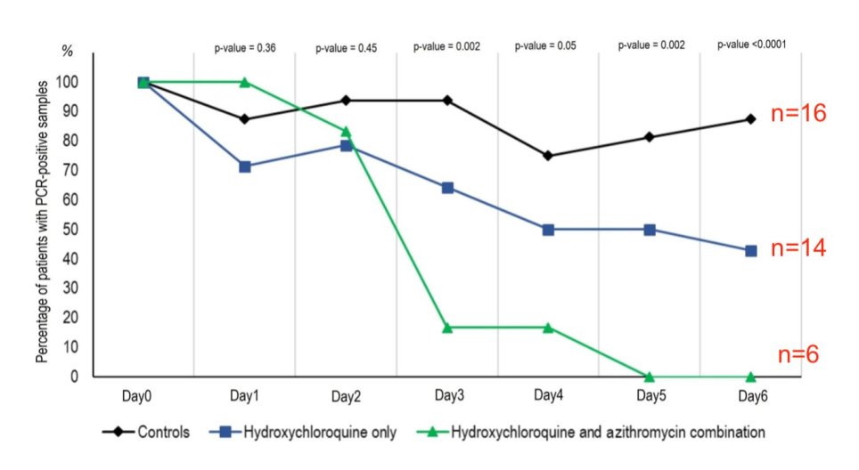 Gautret et al., 2020 makalesinden alınan bir şekil: COVID-19 vakalarındaki PCR pozitifliğini üç farklı hasta grubunda karşılaştırmalı gösteriyor. Yeşil çizgiye göre HQ+AZ ile tedavi edilen 6 hastanın PCR testi 6. Günde negatifti. Her bir gruptaki hasta sayısını gösteren kırmızı rakamlar Elisabeth Bik tarafından eklenmiştir.