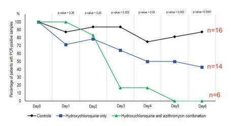 HQ ile tedavi edilen hastalardan 20 tanesi çalışmayı tamamladı. Bunlardan 6 tanesi HQ’e ilaveten Azitromisin denilen bir antibiyotik de aldı. Altı günlük bu çalışma boyunca hastalarda COVID-19 virüsünün varlığı PCR testi ile kontrol edildi. Altıncı gün sonunda, 16 kontrol grubu hastalarının çoğunda, HQ ile tedavi edilen 14 hastanın yarısında PCR testi pozitif bulunurken, HQ+AZ ile tedavi edilen 6 hastanın hiç birinde PCR pozitif çıkmadı. Bu çalışmadan çıkan sonuç HQ tedavisinin, daha da önemlisi HQ+AZ tedavisinin COVID-19 enfeksiyonunu tedavi etmede çok etkili olduğu yönündeydi.
