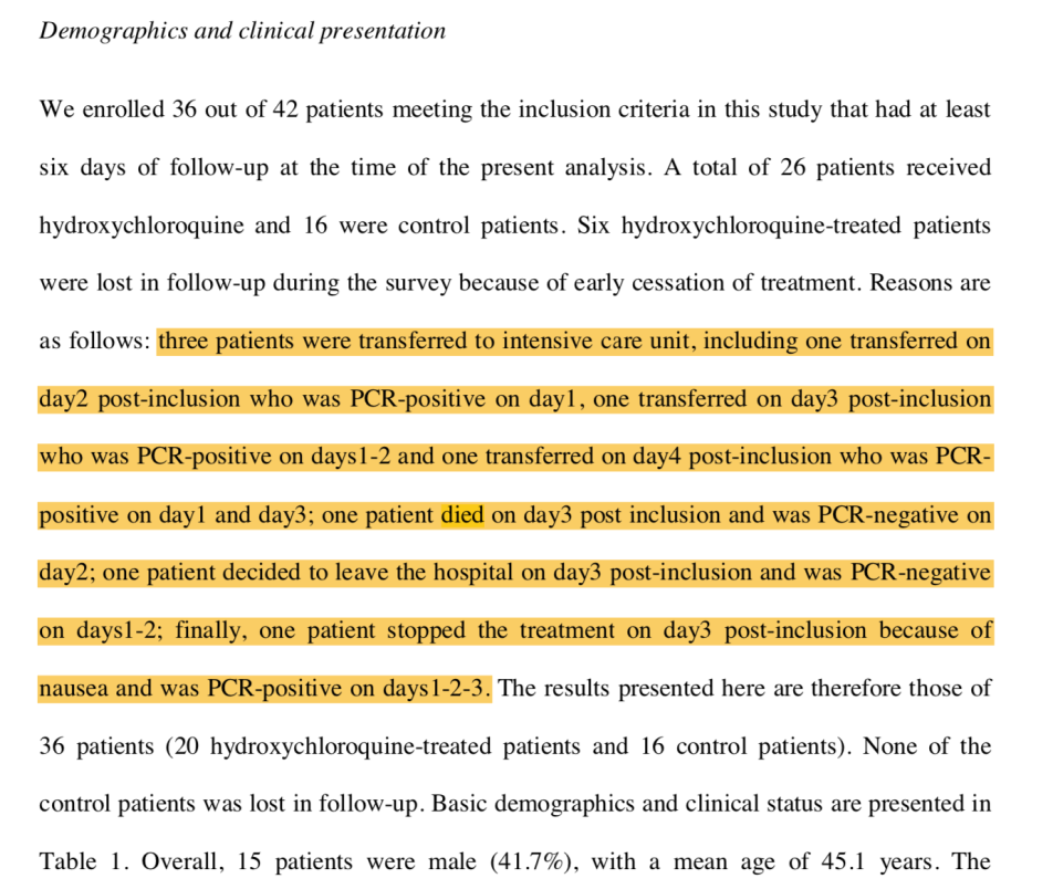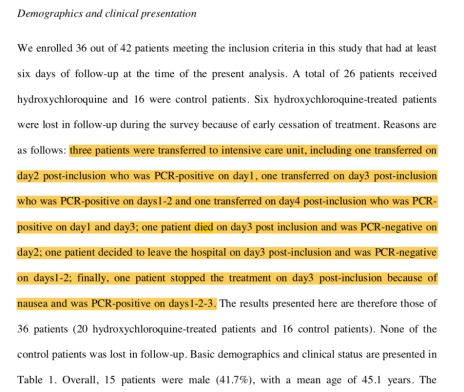 Bu makalede,Marsilya, Nice, Avignon ve Briançon (tamamı Güney Fransa’da) olan hastanelere yatırılmış 42 COVID-19 hastası yer alıyor.Bunlardan 16 adedi normal bakım alırken (kontrol grubu), 26 adedi Hidroksiklorokin (HQ) tedavisi almış. Hidroksiklorokin, normalde lupus ve romatoid artrit gibi hastalıkların tedavisinde kullanılan ve bir sıtma ilacı olan Klorokin ile yakın akraba olan bir ilaç.