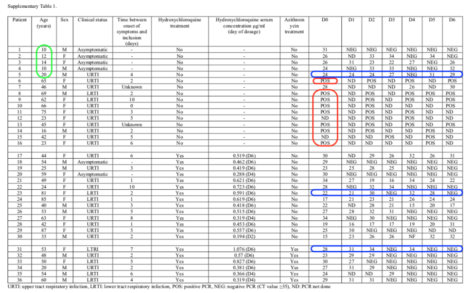 Gautret et al. makalesinden Tablo 1 (Tablo S1) Gautret et al. Renkli kutucuklar Elisabeth Bik tarafından eklenmiştir.