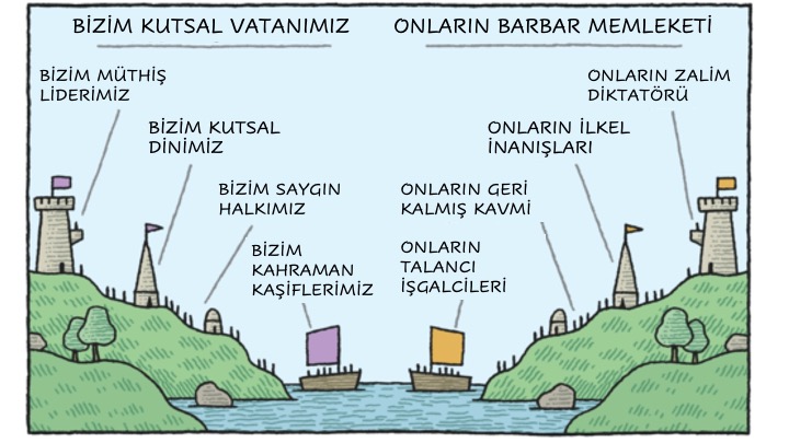 Kavramları değerlendirmemiz kendimizi ait hissettiğimiz tarafa göre değişiyor (Karikatürün orijinali: Tom Gauld, çeviren: Işıl Arıcan)