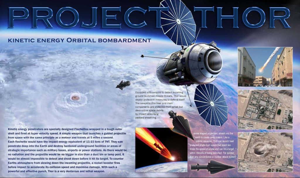 HAARP, kötücül güçlerin tek silahı değildi. Şeytani planlarından birisi de uydulardan devasa metal çubuklar bırakmak, bu çubukların yere şiddetle çarptıkları noktalarda fayların kırılmasına neden olmaktı. Bu iddia, aslında soğuk savaş döneminden kalma, “Project Thor”, veya kinetik bombardıman ismiyle bilinen kuramsal bir silah fikrine dayanmaktadır.