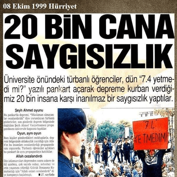 Politik aidiyetlerin, deprem karşısındaki tutumumuzu etkilediğine ilişkin çok sayıda örnek vardır, 1999 depremini yaşayanlar depremin merkezine çok yakın olan Gölcük Deniz Üssü’nde yaşanan felaketi hatırlayacaktır. Tamamen yıkılan üste bir amiral ve iki yüzün üzerinde denizci hayatını kaybetti. Bu olay, 28 Şubat döneminin oluşturduğu gergin politik ortamının etkisiyle İslamcı kanatta helak anlatısıyla uyumlu bir “ilahi ceza” söyleminin kullanılmasına yol açtı. Dönemin kutuplaşmasını belki de en çarpıcı şekilde yansıtan fotoğraf, başörtüsü eylemlerinde açılan o acımasız “7.4 yetmedi mi?” pankartıydı.