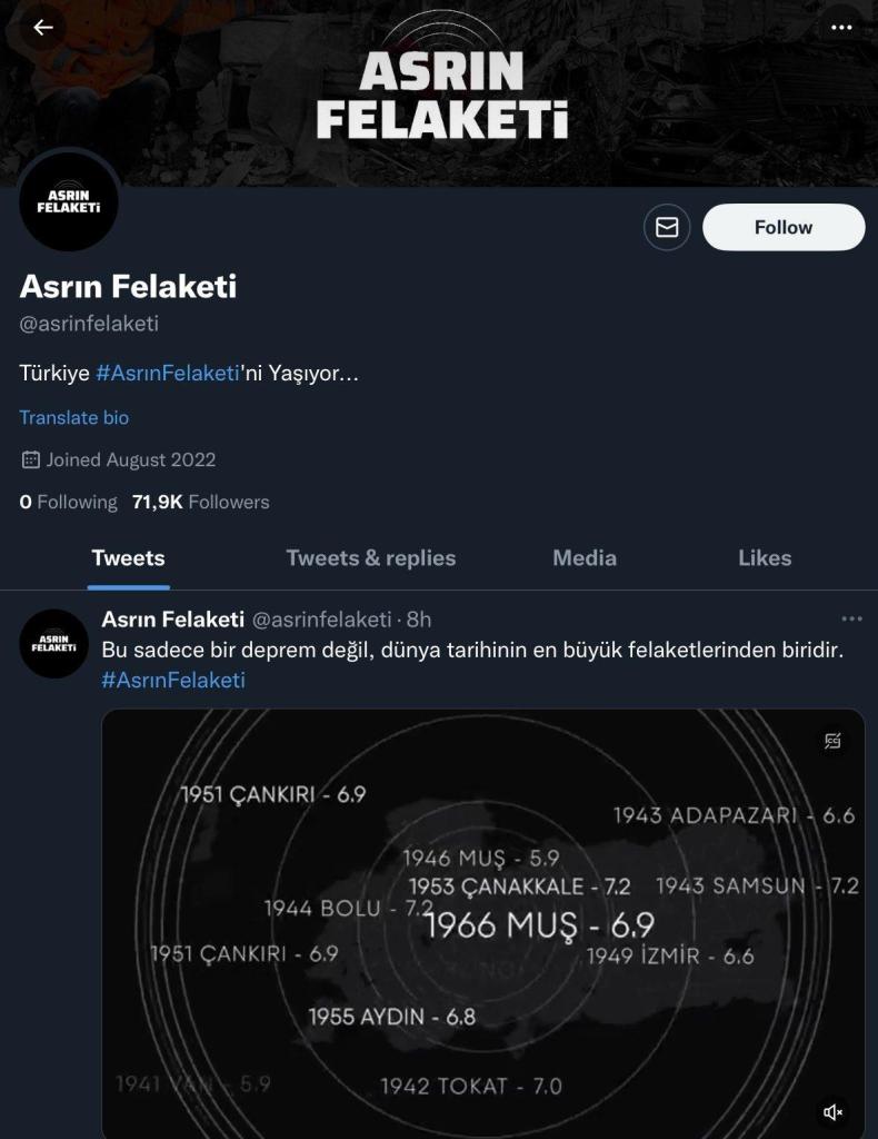Öte yandan -artık hükümette olan- İslamcı kanadın 6 Şubat depremine olan yaklaşımı “ilahi ceza” yorumundan oldukça uzaktaydı. Bu defa ilk hamle, “Asrın Felaketi” isimli bir Twitter hesabı oluşturmak ve aynı slogan eşliğinde “yaşanan felaketin önlem alınamayacak kadar devasa olduğu” anlatısını yerleştirmeye çalışmak oldu. Oluşan yoğun tepkiler üzerine hesap kapatılsa da hükümetin ve ona yakın medyanın temel stratejisi değişmedi, aynı anlatı diğer kanallarda devam etti. Bu arada, TRT ve diğer hükümet yanlısı medya, hükümeti zayıf gösterebilecek komplo teorilerini çürütmek için uğraşırken, yalan haber ve dezenformasyonun “diğerleri” tarafından yayıldığını ima eden yayınlar yaptı.