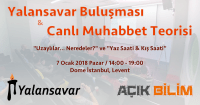 Muhabbet Teorisi Canlı Gösterisi ve Yalansavar Buluşması etkinlikleri 2018 yılında da devam ediyor! Bu ay Tevfik Uyar, “Uzaylılar… Neredeler?” sunumuyla bizlerle olacak. Evrende yalnız mıyız? Bu sorunun yanıtını net olarak bilmiyoruz. Bildiğimiz tek şey, bugüne dek evrende bizim dışımızda bir yaşam olduğuna dair hiçbir kanıt bulamamış olduğumuz. Kanıt olduğu iddia edilen sözde şeyler ise ya […]
